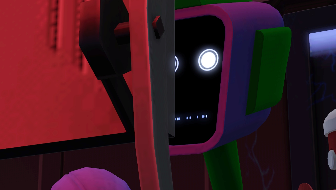 ROB-E cut in front of ARTI and stopped him from descending the stairs.
